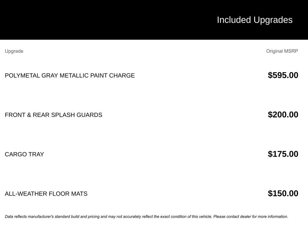 12 Speakers, 4-Wheel Disc Brakes, ABS brakes, Air Conditioning, Alloy wheels, AM/FM radio: SiriusXM 360L, AppLink/Apple CarPlay and Android Auto, Auto High-beam Headlights, Auto-dimming Rear-View mirror, Automatic temperature control, Brake assist, Bumpers: body-color, Cargo Tray, Compass, Delay-off headlights, Driver door bin, Driver vanity mirror, Dual front impact airbags, Dual front side impact airbags, Electronic Stability Control, Emergency communication system: 911 Emergency Notification, Exterior Parking Camera Rear, Four wheel independent suspension, Front and Rear Splash Guards, Front anti-roll bar, Front Bucket Seats, Front Center Armrest w/Storage, Front dual zone A/C, Front reading lights, Fully automatic headlights, Garage door transmitter: HomeLink, Heads-Up Display, Heated and Ventilated Front Bucket Seats, Heated door mirrors, Heated front seats, Heated rear seats, Heated steering wheel, Illuminated entry, Knee airbag, Leather Seat Trim, Leather Shift Knob, Leather steering wheel, Low tire pressure warning, Memory seat, Navigation system: Google built-in, Occupant sensing airbag, Outside temperature display, Overhead airbag, Overhead console, Panic alarm, Passenger door bin, Passenger vanity mirror, Polymetal Gray Metallic Paint Charge, Power door mirrors, Power driver seat, Power Liftgate, Power moonroof, Power passenger seat, Power steering, Power windows, Radio data system, Radio: AM/FM/HD Audio System, Rain sensing wipers, Rear anti-roll bar, Rear reading lights, Rear seat center armrest, Rear window defroster, Rear window wiper, Remote keyless entry, SiriusXM 3 Year Traffic and Travel Link Subscription, Speed control, Speed-sensing steering, Split folding rear seat, Spoiler, Steering wheel mounted audio controls, Tachometer, Telescoping steering wheel, Tilt steering wheel, Traction control, Trip computer, Turn signal indicator mirrors, Variably intermittent wipers, Ventilated front seats, and Wheels: 19 x 7J Aluminum Alloy.