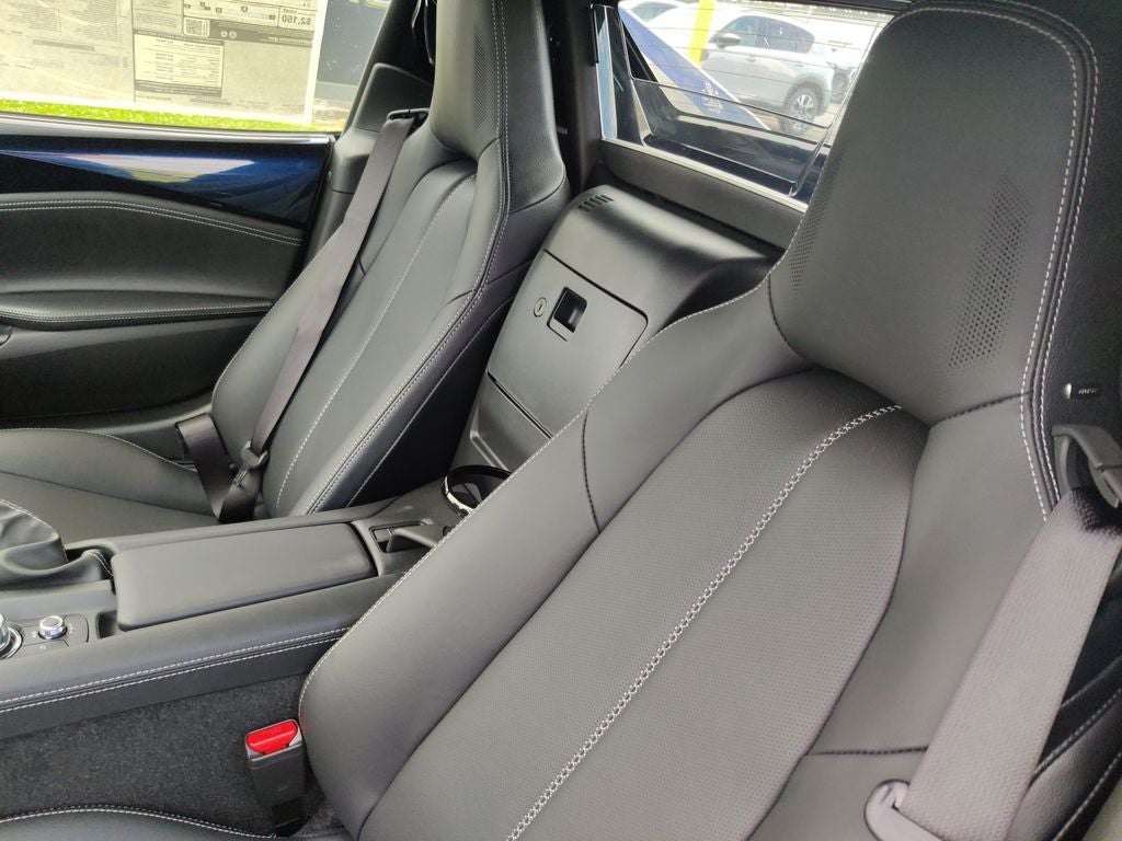 4-Wheel Disc Brakes, 9 Speakers, ABS brakes, Air Conditioning, Alloy wheels, AM/FM radio: SiriusXM, AppLink/Apple CarPlay and Android Auto, Auto High-beam Headlights, Auto-dimming door mirrors, Auto-dimming Rear-View mirror, Automatic temperature control, Black Lug Nuts and Black Wheel Locks, Brake assist, Bumpers: body-color, Cargo Net, Convertible HardTop, Convertible roof lining, Convertible roof wind blocker, Delay-off headlights, Driver vanity mirror, Dual front impact airbags, Dual front side impact airbags, Electronic Stability Control, Emergency communication system: MAZDA CONNECT, Exterior Parking Camera Rear, Four wheel independent suspension, Front anti-roll bar, Front Bucket Seats, Front Center Armrest, Fully automatic headlights, Garage door transmitter: HomeLink, Glass rear window, Heated door mirrors, Heated Front Bucket Seats, Heated front seats, Illuminated entry, Leather Shift Knob, Leather Upholstery, Low tire pressure warning, MAZDA CONNECT Infotainment System, Navigation System, Occupant sensing airbag, Outside temperature display, Panic alarm, Passenger vanity mirror, Power convertible roof, Power door mirrors, Power steering, Power windows, Radio data system, Radio: Bose Audio System with Audiopilot, Rain sensing wipers, Rear anti-roll bar, Rear window defroster, Remote keyless entry, Speed control, Speed-sensing steering, Sport steering wheel, Steering wheel mounted audio controls, Tachometer, Telescoping steering wheel, Tilt steering wheel, Traction control, Trip computer, Variably intermittent wipers, and Wheels: 17 x 7 Aluminum Alloy with Black Metallic Finish.