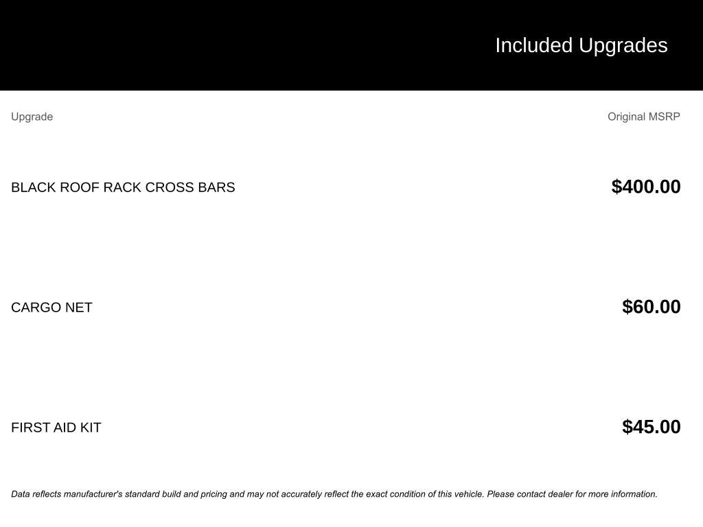 4-Wheel Disc Brakes, 8 Speakers, ABS brakes, Air Conditioning, Alloy wheels, AM/FM radio, AppLink/Apple CarPlay and Android Auto, Auto High-beam Headlights, Auto-dimming Rear-View mirror, Automatic temperature control, Black Roof Rack Cross Bars, Brake assist, Bumpers: body-color, Cargo Net, Compass, Delay-off headlights, Driver door bin, Driver vanity mirror, Dual front impact airbags, Dual front side impact airbags, Electronic Stability Control, Emergency communication system: 911 Emergency Notification, Exterior Parking Camera Rear, Four wheel independent suspension, Front anti-roll bar, Front Bucket Seats, Front Center Armrest w/Storage, Front dual zone A/C, Front reading lights, Fully automatic headlights, Garage door transmitter: HomeLink, Heads-Up Display, Heated door mirrors, Heated Front Bucket Seats, Heated front seats, Heated steering wheel, Illuminated entry, Knee airbag, Leather Shift Knob, Leather steering wheel, Leatherette Seat Trim with Microsuede Insert, Low tire pressure warning, Memory seat, Navigation system: Google built-in, Occupant sensing airbag, Outside temperature display, Overhead airbag, Overhead console, Panic alarm, Passenger door bin, Passenger vanity mirror, Power door mirrors, Power driver seat, Power Liftgate, Power steering, Power windows, Radio data system, Radio: AM/FM/HD Audio System, Rain sensing wipers, Rear anti-roll bar, Rear reading lights, Rear seat center armrest, Rear window defroster, Rear window wiper, Remote keyless entry, Speed control, Speed-sensing steering, Split folding rear seat, Spoiler, Steering wheel mounted audio controls, Tachometer, Telescoping steering wheel, Tilt steering wheel, Traction control, Trip computer, Turn signal indicator mirrors, Variably intermittent wipers, and Wheels: 19 x 7J Aluminum Alloy.