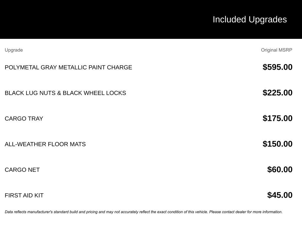 4-Wheel Disc Brakes, 8 Speakers, ABS brakes, Air Conditioning, Alloy wheels, AM/FM radio, AppLink/Apple CarPlay and Android Auto, Auto High-beam Headlights, Auto-dimming Rear-View mirror, Automatic temperature control, Black Lug Nuts and Black Wheel Locks, Brake assist, Bumpers: body-color, Cargo Net, Cargo Tray, Compass, Delay-off headlights, Driver door bin, Driver vanity mirror, Dual front impact airbags, Dual front side impact airbags, Electronic Stability Control, Emergency communication system: 911 Emergency Notification, Exterior Parking Camera Rear, Four wheel independent suspension, Front anti-roll bar, Front Bucket Seats, Front Center Armrest w/Storage, Front dual zone A/C, Front reading lights, Fully automatic headlights, Garage door transmitter: HomeLink, Heads-Up Display, Heated door mirrors, Heated Front Bucket Seats, Heated front seats, Heated steering wheel, Illuminated entry, Knee airbag, Leather Shift Knob, Leather steering wheel, Leatherette Seat Trim with Microsuede Insert, Low tire pressure warning, Memory seat, Navigation system: Google built-in, Occupant sensing airbag, Outside temperature display, Overhead airbag, Overhead console, Panic alarm, Passenger door bin, Passenger vanity mirror, Polymetal Gray Metallic Paint Charge, Power door mirrors, Power driver seat, Power Liftgate, Power steering, Power windows, Radio data system, Radio: AM/FM/HD Audio System, Rain sensing wipers, Rear anti-roll bar, Rear reading lights, Rear seat center armrest, Rear window defroster, Rear window wiper, Remote keyless entry, Speed control, Speed-sensing steering, Split folding rear seat, Spoiler, Steering wheel mounted audio controls, Tachometer, Telescoping steering wheel, Tilt steering wheel, Traction control, Trip computer, Turn signal indicator mirrors, Variably intermittent wipers, and Wheels: 19 x 7J Aluminum Alloy.
