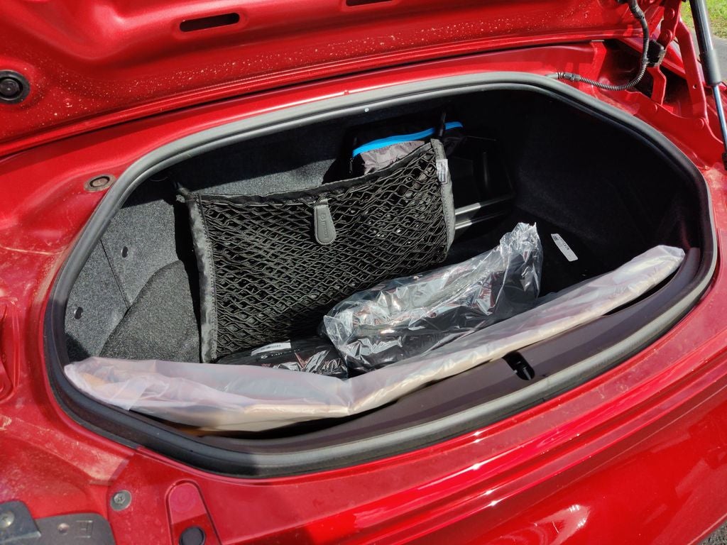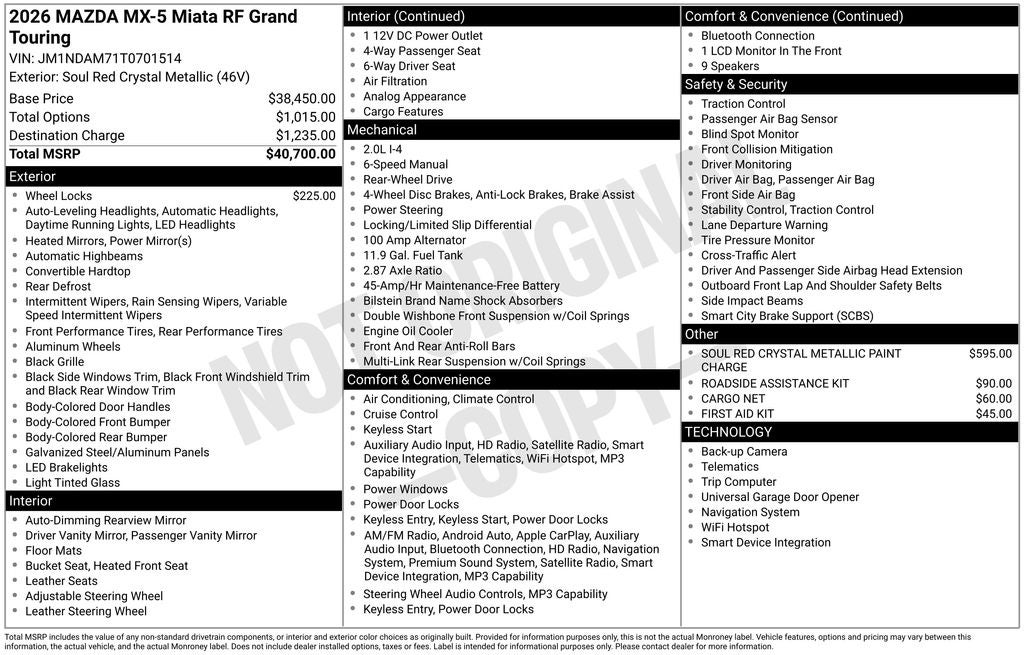 4-Wheel Disc Brakes, 9 Speakers, ABS brakes, Air Conditioning, Alloy wheels, AM/FM radio: SiriusXM, AppLink/Apple CarPlay and Android Auto, Auto High-beam Headlights, Auto-dimming door mirrors, Auto-dimming Rear-View mirror, Automatic temperature control, Black Lug Nuts and Black Wheel Locks, Brake assist, Bumpers: body-color, Cargo Net, Convertible HardTop, Convertible roof lining, Convertible roof wind blocker, Delay-off headlights, Driver vanity mirror, Dual front impact airbags, Dual front side impact airbags, Electronic Stability Control, Emergency communication system: MAZDA CONNECT, Exterior Parking Camera Rear, Four wheel independent suspension, Front anti-roll bar, Front Bucket Seats, Front Center Armrest, Fully automatic headlights, Garage door transmitter: HomeLink, Glass rear window, Heated door mirrors, Heated Front Bucket Seats, Heated front seats, Illuminated entry, Leather Shift Knob, Leather Upholstery, Low tire pressure warning, MAZDA CONNECT Infotainment System, Navigation System, Occupant sensing airbag, Outside temperature display, Panic alarm, Passenger vanity mirror, Power convertible roof, Power door mirrors, Power steering, Power windows, Radio data system, Radio: Bose Audio System with Audiopilot, Rain sensing wipers, Rear anti-roll bar, Rear window defroster, Remote keyless entry, Soul Red Crystal Metallic Paint Charge, Speed control, Speed-sensing steering, Sport steering wheel, Steering wheel mounted audio controls, Tachometer, Telescoping steering wheel, Tilt steering wheel, Traction control, Trip computer, Variably intermittent wipers, and Wheels: 17 x 7 Aluminum Alloy with Black Metallic Finish.