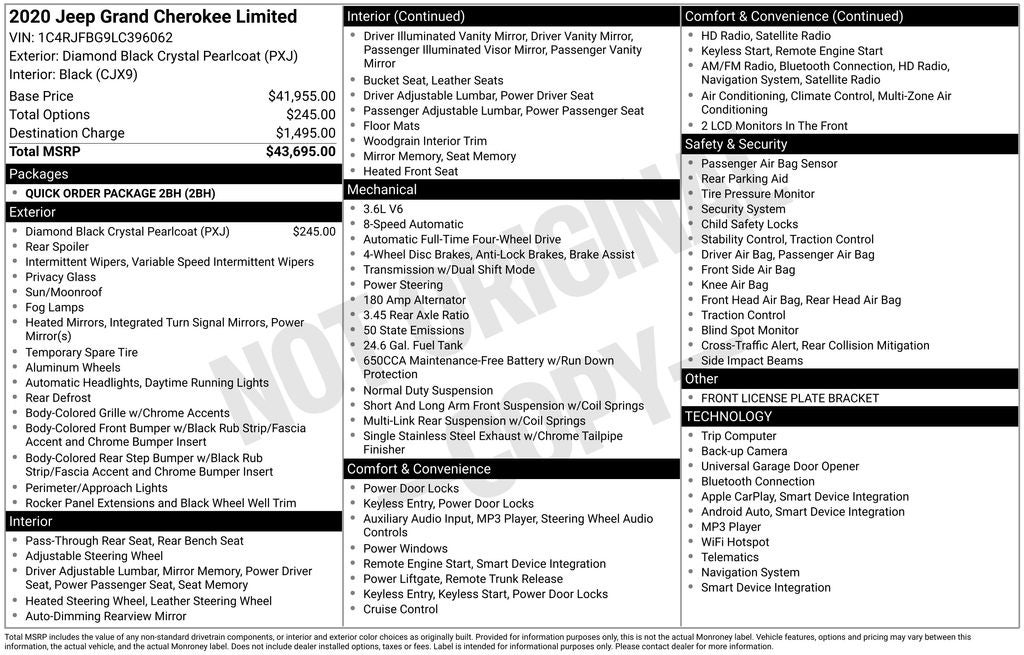 Diamond Black Crystal Pearlcoat 2020 Jeep Grand Cherokee Limited 4WD 8-Speed Automatic 3.6L V6 24V VVT